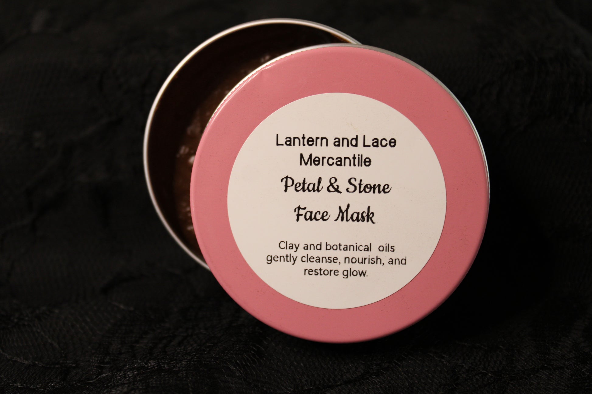 All natural paint on face mask. Ingredients include, clay, rosa canina, jojoba oil, vitamin E oil, essential oils and bees wax.